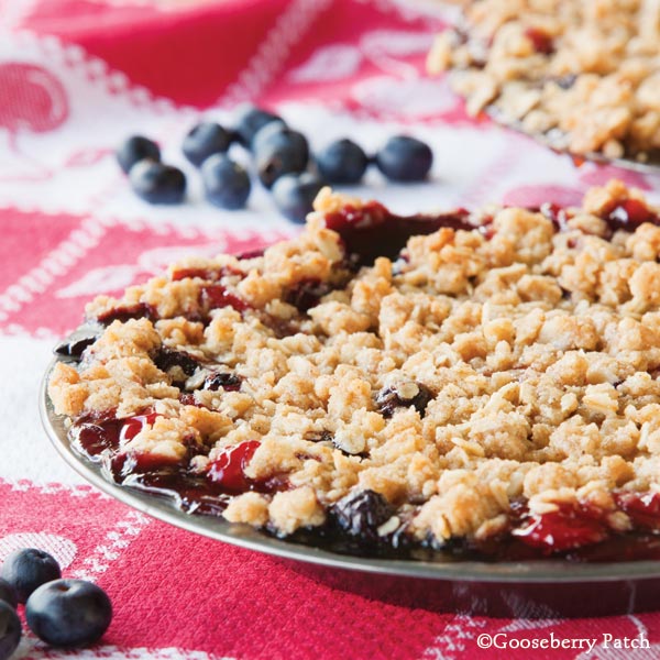 21-oz. can cherry pie filling 2 c. fresh blueberries 1/4 c. butter 1/3 c. long-cooking oats, uncooked 1/3 c. all-purpose flour 1/4 c. brown sugar, packed 1 t. sugar 1/4 t. cinnamon Garnish: whipped cream