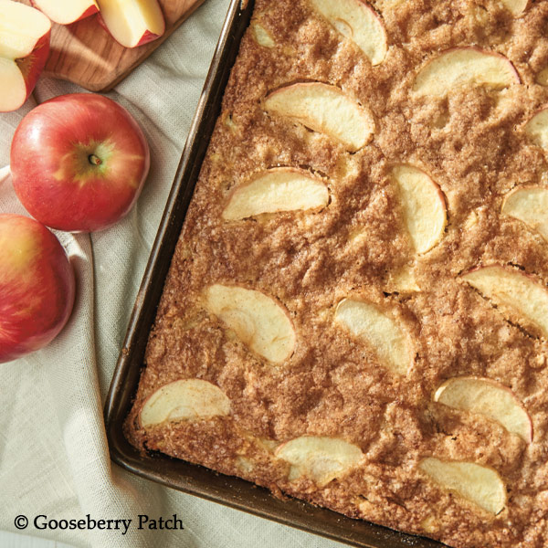 Mix all ingredients together except sliced apple. Press into an ungreased 11"x17" sheet pan. Arrange sliced apples on top. Bake at 350 degrees for 40 minutes. Cool and cut into squares. Makes one dozen.
