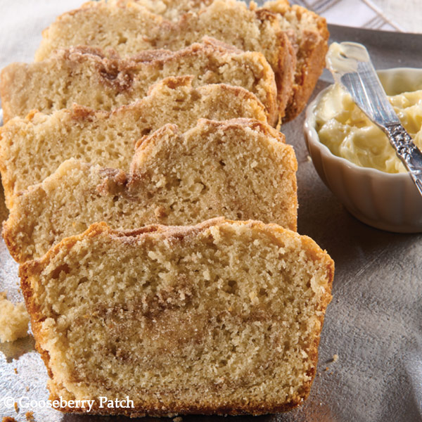 remaining sugar. In another bowl, whisk together egg, milk, oil and vanilla. Add egg mixture to flour mixture; stir just until combined. Pour half of batter into loaf pan; sprinkle with half of cinnamon-sugar. Add remaining batter; use a knife to swirl batter. Top with remaining cinnamon-sugar. Bake at 350 degrees for 45 minutes, or until a toothpick inserted in the center comes out clean. Cool in pan on a wire rack for 10 minutes. Remove loaf from pan onto a plate or small platter. Carefully press all the sides of the loaf into any cinnamon-sugar that comes off onto the plate. Slice and serve. Makes one loaf.