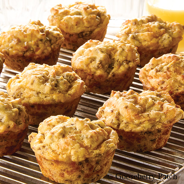 Combine sausage, baking mix and cheese in a large bowl; make a well in center of mixture. Stir together soup and water; add to sausage mixture, stirring just until combined. Spoon into lightly greased muffin cups,