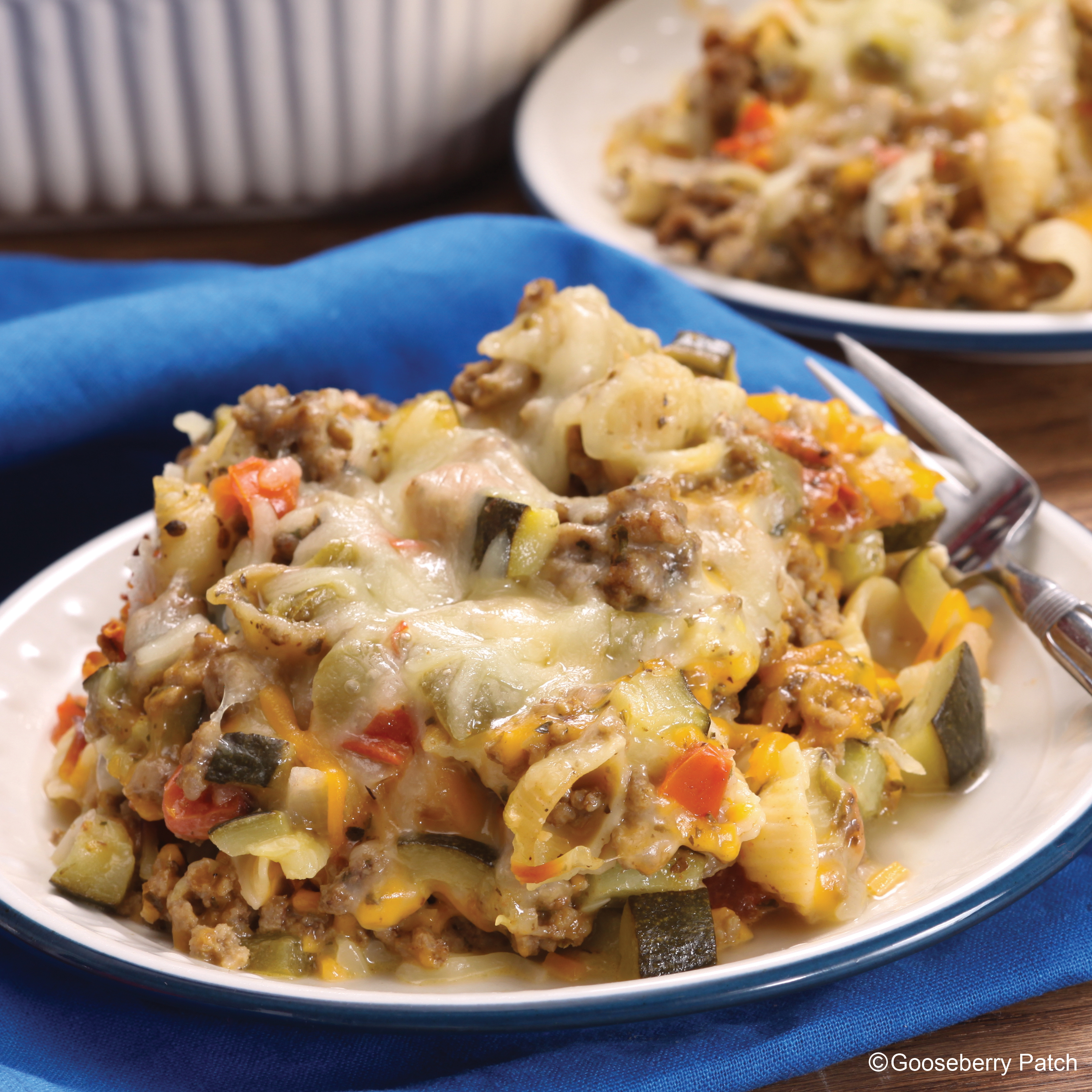 1 lb. ground beef 1 lb. ground pork sausage 2 c. zucchini, diced 1 c. onion, diced 1 c. green pepper, diced 1 c. tomato, diced 1 c. water 1/2 c. shell macaroni, uncooked 2 to 3 t. dried oregano 2 t. salt 2 c. shredded Cheddar cheese 2 c. shredded mozzarella cheese