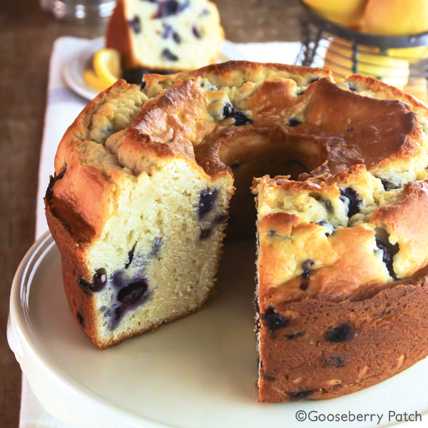 2-1/2 c. sugar 1/2c. butter, softenend 2 t. vanilla 8-oz. pkg. cream cheese, softened 4 eggs 2 c. fresh blueberries 3 c. all-purpose flour, divided 1 t. baking powder 1/2 t. baking soda 1/2 t. salt 8-oz. container lemon yogurt