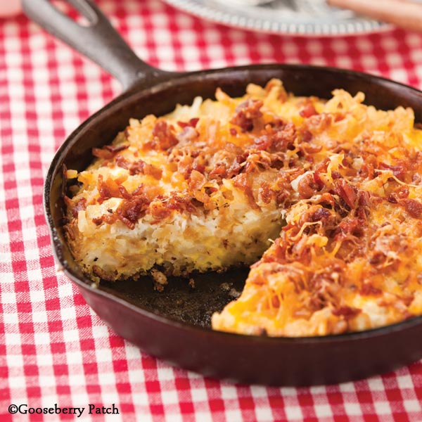 Heat oil in a large skillet over medium heat. Add hashbrowns and cook for 10 to 15 minutes, stirring often, until golden. In a bowl, whisk together eggs and milk. Pour egg mixture over hashbrowns in skillet; sprinkle with bacon. Cover and reduce heat to low. Cook for 10 minutes, or until eggs are set. Sprinkle with cheese; remove from heat, cover, and let stand about 5 minutes, until cheese is melted. Cut into wedges to serve. Makes 6 servings.