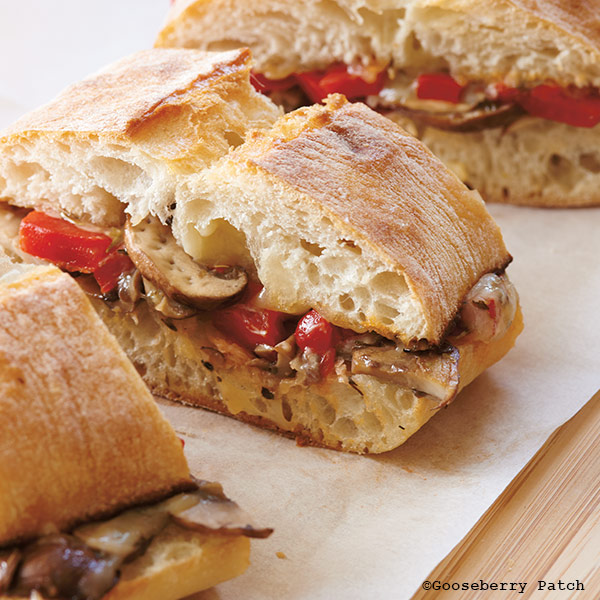 In a skillet over medium heat, sauté mushrooms in olive oil until tender. Place bread halves on an ungreased baking sheet. On one bread half, layer peppers, mushrooms and Italian seasoning. Top both halves evenly with cheese. Broil until lightly golden. Assemble sandwich and cut into 4 pieces. Makes 4 servings.