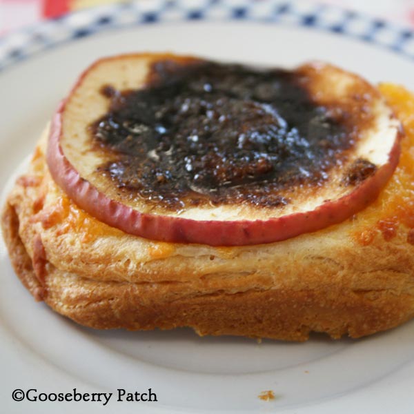 Split biscuits. Lay each biscuit half on an ungreased baking sheet. Sprinkle about 2 tablespoons of cheese on each biscuit. Top with an apple slice. In a bowl, mix together cinnamon and brown sugar. Spoon some cinnamon-sugar on top of each apple slice. Top with a small amount of butter. Bake, uncovered, at 400 degrees for 15 to 20 minutes, or until golden. Makes 16.