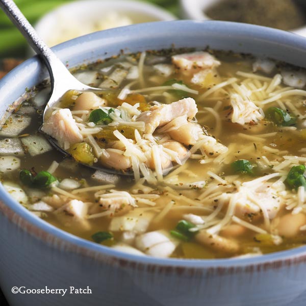 2 T. oil 1 onion, finely chopped 4-oz. can chopped green chiles 2 t. garlic powder 2 t. salt 2 t. cumin 2 t. dried oregano 2 t. coriander 1/2 t. cayenne pepper 2 15.8-oz. cans Great Northern beans, undrained 2 10-1/2 oz. cans chicken broth 2 5-oz. cans chicken, drained